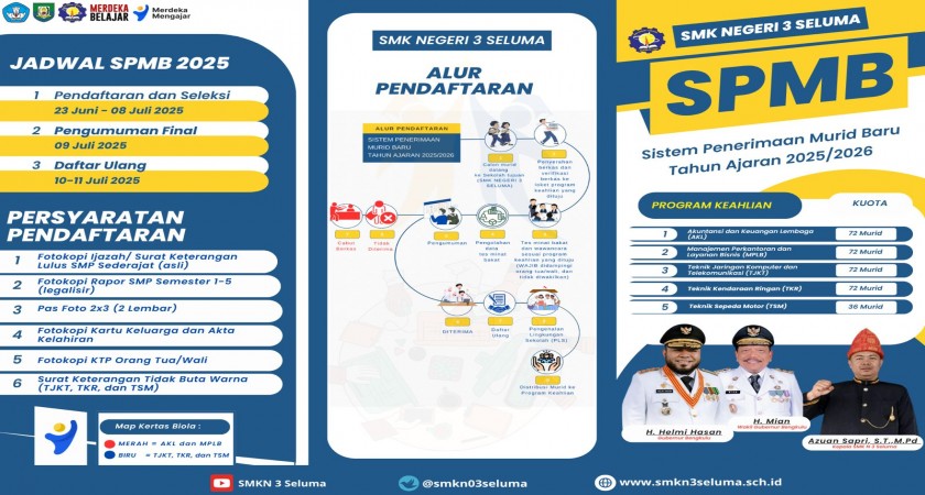 Pengumuman sementara SPMB (Seleksi Penerimaan Murid Baru) SMK Negeri 3 Seluma untuk tahun ajaran 2025/2026 sudah dirilis secara resmi. Siswa dapat memantau pengumuman lebih lanjut