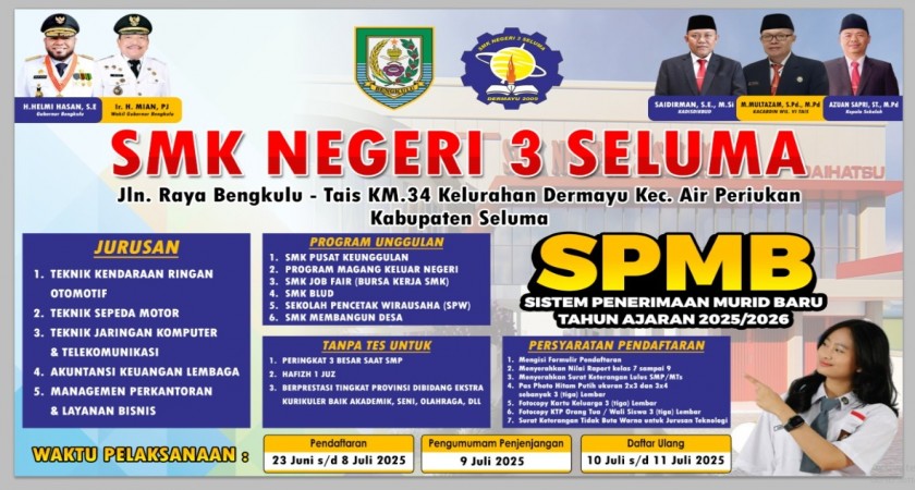 Senin tanggal 30 Juni 2025 Pengumuman sementara SPMB (Seleksi Penerimaan Murid Baru) SMK Negeri 3 Seluma untuk tahun ajaran 2025/2026 sudah dirilis secara resmi. Siswa dapat memant